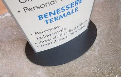 Sconto 50% dal prezzo indicato. Totem Pubblicitario bifacciale in alluminio su base ovale in metallo verniciato. Dimensioni cm 30 x 150 - Base cm 38 x 25. Possibilità di inserire 2 grafiche pubblicitarie intercambiabili (fronte e retro) con copertura in acetato trasparente.