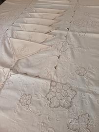 Tovaglia 260 x 170 cm completa di 12 tovaglioli 40 x 40 cm. Realizzata è rifinita completamente a mano con ricami vari su bellissimo lino écru. Punto ombra, punto pieno, cordoncino, sfilato e delicati grappoli d uva in armoniosa disposizione. Tovaglia di pregio, osservare particolari in foto, per occasioni e ricorrenze. Mai utilizzata. Nuova senza macchie e difetti.