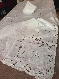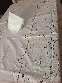 Tovaglia completa di 12 tovaglioli in bianco lino completamente ricamata a intaglio eseguito a mano. Per chi ama l intaglio, un esplosione di intaglio perfetto eseguito da mani esperte. La tovaglia è nuova senza macchie e difetti. Misura 257 x 166 cm. Piccolo intaglio anche nei 12 tovaglioli rifiniti a mano di misura 41 x 42 cm.