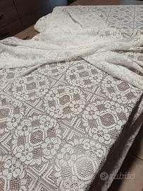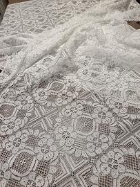 Tovaglia copritavolo interamente in delicato pizzo di Calais bianco candido di antica manifattura meccanica francese. Rifinitura su tutti i 4 lati. Misure 180 x 174 cm.