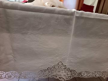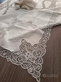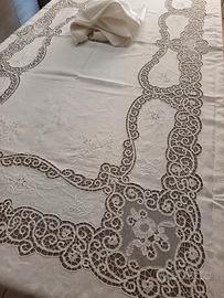 Tovaglia rettangolare bianca, completa di 12 tovaglioli, in lino ricamata a mano e arricchita al centro e nei lati, con. importanti applicazioni di Merletto di Cantù tono su tono. Misure tovaglia 255 x 170 cm. Misure tovaglioli 44 x 42 cm. No macchie no difetti no strappi.