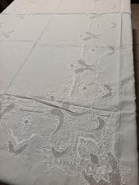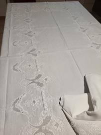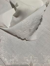 tovaglia bianca rettangolare in lino completa di 12 tovaglioli. Varietà di ricamo eseguito a mano in ogni particolare, seguendo disegni floreali di particolare bellezza. Misure 265 x 175 cm. Tovaglioli con ugual ricamo all angolo di misure 42 x 42 cm. Corredo anni 50. Mai utilizzata no macchie no difetti no strappi.