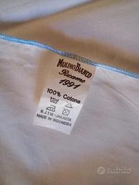 Nuova, mai usata, di colore bianco e con ricami azzurri a tema di rondine