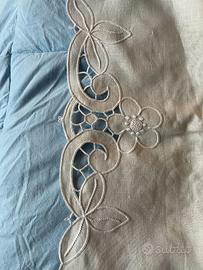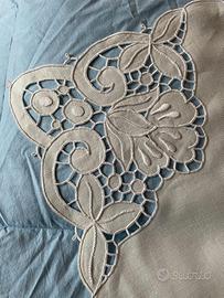 Tovaglia rettangolare con 12 tovaglioli in puro lino ricamata a traforo con punto pieno, punto nodini all’interno di alcuni fiori e con tutti gli orli a punto smerlo. La tovaglia ed i tovaglioli non sono mai stati usati. Sono stati fatti a mano e ricamati da una esperta ricamatrice di Comacchio negli anni 1972 o 1973. Il set era stato creato per fare parte del corredo di matrimonio di mia mamma, che però non lo ha mai usato e lo ha sempre conservato in un armadio, lontano da muffa o insetti. La stoffa è in perfette condizioni, ancora piegata così come era stata confezionata dalla ricamatrice ed è ancora conservata nella sua confezione originale comprendente scatola ed anche il pezzo di lino avanzato dai ritagli di cucitura. Dimensioni della tovaglia: lunghezza 270cm, larghezza 166cm. Dimensioni dei tovaglioli: 56cmx56cm