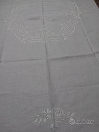 Tovaglia tonda bianca ricamata e rifinita a mano. Diametro 170 cm . Completa di 8 tovaglioli ricamati e rifiniti a mano misure 40 x 42 cm. Nessun difetto, mai utilizzata.