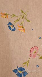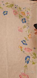 Tovaglia in lino grezzo con fiori ricamati a mano, mai usata , in confezione originale