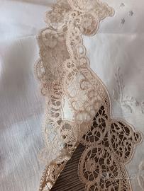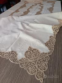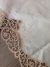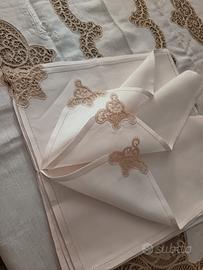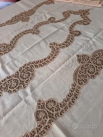 Tovaglia ricamata a mano in tono su puro lino color panna. Delicato e pregiato Merletto di Cantù écru, applicato su tutti i bordi, gli angoli e nella parte centrale. 12 tovaglioli al Cantù negli angoli e orlo a giorno di rifinitura. Misura della tovaglia 280 x 180 cm. Misura tovaglioli 41 x 41 cm. Perfetta, mai utilizzata, prova di macchie e difetti.
