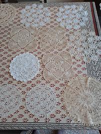 Tovaglia rotonda e 13 centrini fatti a mano ad uncinetto. Tutto in ottimo stato, senza segni né ingialliti. Lavati, pronti all'uso. Misure in foto.