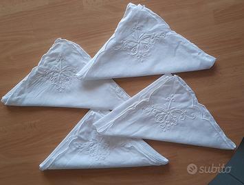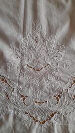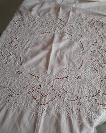 Elegante set da tavola vintage composto da una tovaglia rotonda diametro 168 e 4 tovaglioli coordinati. In pregiata fiandra (probabilmente cotone o misto lino) ottima consistenza caratterizzata da una trama fitta. Ricamo artigianale a intaglio eseguito interamente mano, i decori floreali presentano raffinati inserti a punto rete e finiture a punto pieno, bordo interamente smerlato. I quattro tovaglioli richiamano il motivo della tovaglia su un angolo. Ottime condizioni vintage, tessuto sano, robusto e bianco,mai usata. Ideale per amanti della biancheria d'epoca e corredi fatti a mano.