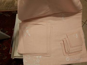 Quella rosa confetto pallido, in bisso finissimo (278 x 167) con 12 inserti in pizzo al tombolo e tenui ricami bianchi, dispone di doppi tovaglioli (da tavola e da cocktail).