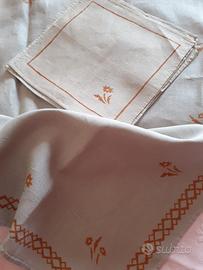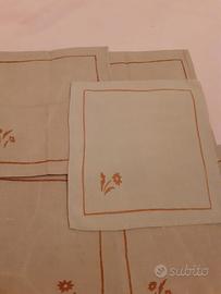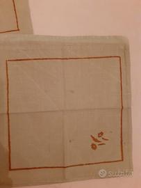 Due tovagliette da te' (misura 78x70) dell'antica stamperia Pascucci in puro lino finissimo degli anni '50, ognuna con i suoi 6 tovaglioli, tutto in ottimo stato (un solo tovagliolo con 2 piccole macchie ed uno piu' chiaro perche' lavato, con l'eventuale lavaggio degli altri finiranno per diventare uniformi). Prezzo solo in blocco 120 euro.