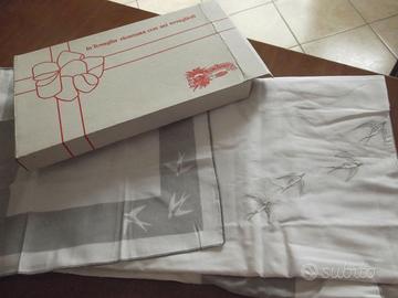 1 tavaglia anni '90, grigio perla, con stampa rondini, cm. 145x180; 1 tovaglia anno '91, stampa rondini azzurra cm. 180x140; 1 tavaglia anno '92, ricamata fiori e rondini cm. 177x141; 1 tovaglia in fiandra con orlo a giorno anno '93, cm. 144x180. Tutte in cotone con tovaglioli. € 15 l'una.