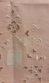 Tovaglietta cm. 71x73 prima metà del 900. Lino o misto lino color rosa, spettacolare ricamo intatto interamente mano. Orlo cucito a mano. In eccellenti condizioni.