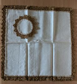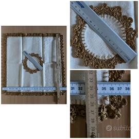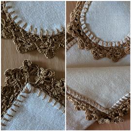 L'intero servizio è rifinito da una bordatura di pizzo eseguito a mano all'uncinetto, in una gradazione di marrone che ben si abbina al color crema.