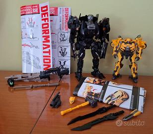 - Bumblebee Dark of the Moon, copia dello studio series 87 Deluxe Class (96€ su Amazon). Alto 11,5 cm è di buona qualità, non ha scatola, ha incluse varie armi tra cui l'iconica maschera e lama (Bumblebee 2018). La trasformazione è abbastanza complessa per i più piccoli. Trasformato una volta per verificarne l'integrità. Incluso il foglio delle istruzioni per la trasformazione.