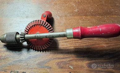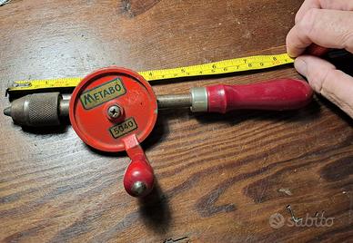 Trapano a mano Metabo d'epoca della Germania occidentale. Stile frullino per le uova con bella vernice rossa. Modello 5040. Mandrino per punte fino a mm.8 e lunghezza totale mm.260. Attrezzatura professionale indispensabile per per eseguire forature controllate e di precisione. Oggetto come da foto