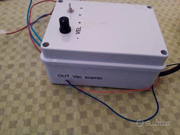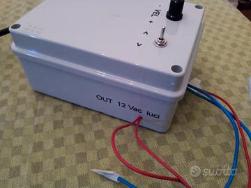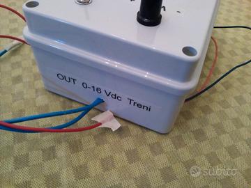 Trasformatore - alimentatore per trenini Lima, con regolatore di velocità elettronica, nuovo e perfettamente funzionante. Progettato per vecchie locomotive analogiche con motore G che difficilmente si riescono a pilotare in modo lineare e a basse velocità. Il materiale in foto è quello che sarà spedito. Questo alimentatore artigianale è stato costruito da un tecnico specializzato con scheda di controllo velocità elettronica in tecnologia PWM, per marcia lenta, fermate e partenze del treno più realistiche. E' presente un commutatore per modificare il senso di marcia. Potenza 60 watt. Uscita 0-16 VDC, (15 treni in H0, 25 in scala N), uscita per pilotare centralina scambi, uscita 12 vac per luci plastico.