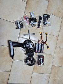 Kit Completo: 4 treni di gomme (incluse le originali), 3 batterie con sacca ignifuga, caricabatterie e radiocomando 2.4GHz.