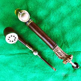 Antiche pipe in legno decorate, lavorate in rilievo, catena con ghiande e testa di leone, inserti in Argento. Parti in corno e guarniture d'argento. Grazie.