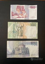 Tre banconote tagli classici della lira italiana emessi dalla Banca d'Italia tra gli anni '80 e '90, prima del passaggio all'euro nel 2002.