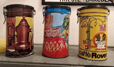 Tra barattoli in da caffè in metallo dai colori vivaci, vintage. Quello giallo caffè Roversi, gli altri due Filicori Zecchini, come da foto. Alt. cm. 20. Altre foto su richiesta. €20 il set da 3 pezzi.