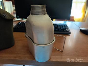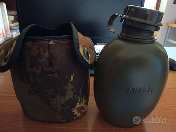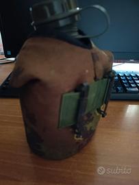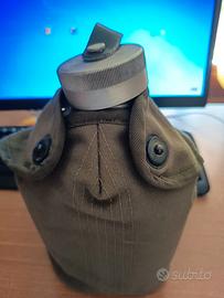 Tre borracce di cui una in plastica colore giallo e tappo a vite assicurato con catenella alla filettatura e inserti laterali per fibbia di trasporto. Una “vintage” in alluminio da due litri E.I. originale con fodero interno stoffa e gavetta anno 1975 sagomata per adattarsi comodamente al corpo. Coperchio con filettatura centrale sulla parte superiore e fissato al corpo della borraccia con un breve tratto di cuoio, custodia con fibbie per allaccio alla cintura. Una militare E.I. da 2 litri, originale, completa di fodero mimetico con chiusra abottoni, capacità: 2 litri, materiale: Plastica - Colore: Verde oliva “vegetato”, sagomata per adattarsi comodamente al corpo. Coperchio con filettatura centrale sulla parte superiore custodia con fibbie per allaccio alla cintura.