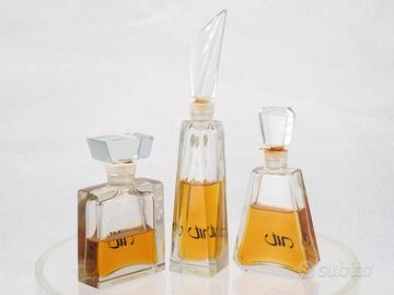 Tre belle bottiglie di profumo da 15/20 ml; quasi sicuramente russe dall'era Sovietica autarchica. Il marchio ci e' sconosciuto, ma l'intaglio delle bottiglie ed il loro moderno design geometrico ci dimostrano l'eccellente qualita'. Tutte le bottiglie sono sigillate ma hanno perso parte del liquido; tutti i vetri in perfette condizioni, senza segni o sbreccature Il prezzo indicato si intende per il lotto di tre