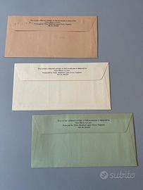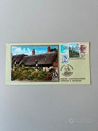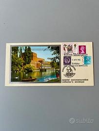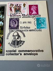 Tre buste commemorative con francobolli d'epoca per collezionisti, incentrate su William Shakespeare e i luoghi a lui associati a Stratford-upon-Avon. Le buste presentano francobolli e timbri postali commemorativi, emesse il 3 aprile 1985, in occasione di un anniversario della nascita di Shakespeare. Dimensioni 22 cm per 11 cm. La prima ha come immagine l'Anne Hathaway's Cottage, casa d'infanzia della moglie di Shakespeare, la seconda un'immagine del monumento a Shakespeare a Stratford-upon-Avon, la terza mostra il Royal Shakespeare Theatre e il fiume Avon. Perfettamente conservate, in condizioni impeccabili. Veri e propri pezzi per collezionisti. Preziose e introvabili. Bellissime.