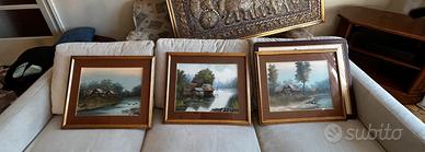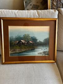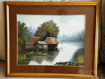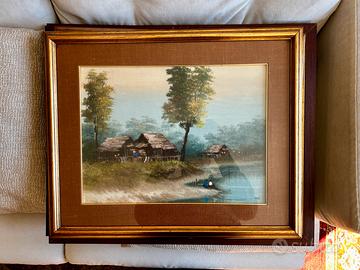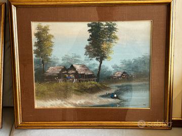 Vendo questo trittico dei dipinti a olio risalente agli anni 60, quando la mia famiglia viveva in Thailandia I dipinti mostrano una serie di paesaggi orientali d'epoca, probabilmente realizzati tra la metà e la fine del XX secolo. Questi tipi di opere spesso raffigurano villaggi su palafitte, mercati galleggianti o scene rurali tipiche del sud-est asiatico, come la Thailandia, il Vietnam o le Filippine. Parino Mercato Antiquario Potrebbero essere opera NK Kampan: Un artista thailandese attivo tra il Vietnam e la Thailandia, i cui paesaggi rurali e scene di villaggio con capanne di paglia sono molto diffusi. V. Chaiduang: Conosciuto per vedute di villaggi vicino all'acqua realizzate in olio su tela verso la fine del XX secolo. Sono molto piacevoli, guardate le eleganza dei passepartout , cornice elegante che ben si adatta in ogni situazione daranno un tocco di eleganza alla vostra casa arte orientale, arte asiatica, arte thailandese, dipinto, Sorio, acquario, stampa, palafitte, fluviali scene fluviali papere, fior di loto