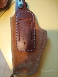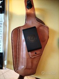 Vendo 3 fondine da cintura, 2 GALCO (Phoenix Arizona USA), modd. S28, MOB 202 e una VEGA IA 320. La GALCO è un azienda sinonimo di manifattura di alta classe, come si può controllare dal loro sito web dedicato. Tali fondine sono prodotte artigianalmente con cuoio di prima scelta e sono preformate, ovvero vengono sagomate in fase di lavorazione per renderle adatte, in questo caso, a pistole auto full size, quali ad esempio Beretta 92, PX, Glock, ecc. ecc. Nelle foto è utilizzata per una PX full size. Acquistate in USA, il costo cadauna era di circa $ 150. La S28, quella con l'arma inserita, è lievemente usata e la vendo ad Euro 40,00. La seconda, MOB 202, con clip da cintura può essere indossata internamente od esternamente alla cintura, sul fianco SX o DX, a seconda se si è mancini o destri ed è nuova, prezzo di vendita Euro 70,00. La terza, marca VEGA, Mod. IA 320, in pelle scamosciata e lucida è stata usata un paio di volte. E' munita di clip da cintura in plastica con attacco reversibile, ovvero utilizzabile dentro o fuori la cinta da destri o da mancini, oppure può essere inserita direttamente nella cintura senza la clip, perchè dotata di passanti indipendenti. Euro 20,00. Se acquistate tutte e tre insieme il prezzo si abbassa ad Euro 80. Non accetto reso.