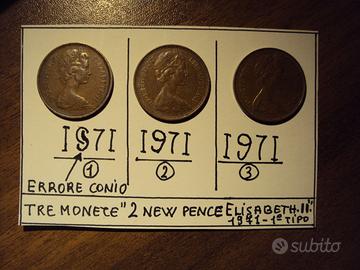 Insieme di tre storiche monete in bronzo raffiguranti la regina Elisabeth II che indossa la "tiara"delle ragazze di Gran Bretagna e Irlanda nel periodo della prima decimalizzazione dell'epoca (1971). Come da foto inserite con scrittura e freccetta indicativa,si nota una particolarità/difetto di conio che la distingue dalle altre..Monete interessanti per collezionisti.Valuto eventuali offerte di veri interessati anche per una o più monete ,lotto di 3 monete = 45 euro