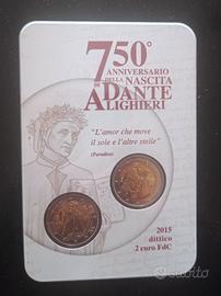 Due monete commemorative da due euro fdc 750esimo anniversario nascita Dante Alighieri.Moneta commemorativa da due euro fdc 200esimo anniversario nascita di Louis Braille.