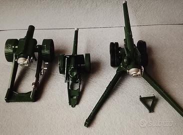 Tre pezzi di artiglieria in metallo anni 70 marca Britains, i meccanismi funzionano tranne uno perché si e rotta ( cotto) la ghiera zigrinata e l' alzo non va, ma c'è l'ho ancora se conoscete un attrezzista per lui e un gioco da ragazzi rifarla, vedi ultima foto e quel pezzetto piccolo...visto e piaciuto....SPEDIZIONE A CARICO VOSTRO ritiro a mano a Parabiago