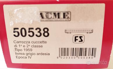 Vendo dalla mia collezione privata articolo nuovo scala 1/87 (HO) con aggiuntivi da montare marca ACME 50538 carrozza cuccette 1959 livrea grigio ardesia a euro 60,00 SPEDIZIONE ESCLUSA!!! Contatto 3315769216 Compatibile con ROCO, LIMA, RIVAROSSI, PIKO, LS MODELS, VITRAINS, REE MODELES, OSKAR. ACME 50538 Carrozza cuccette FS tipo 1959 livrea grigio ardesia a euro 60,00 SPEDIZIONE ESCLUSA!!! SPEDIZIONE CON POSTE ITALIANE A EURO 10,00!!! PER PIÙ ACQUISTI SPEDIZIONE UNICA ENTRO I LIMITI DI PESO!!! PREZZO NON TRATTABILE!!! MAI ESPOSTO IN VETRINA!!! ARTICOLO NUOVO!!! SOLO COLLEZIONATO!!!