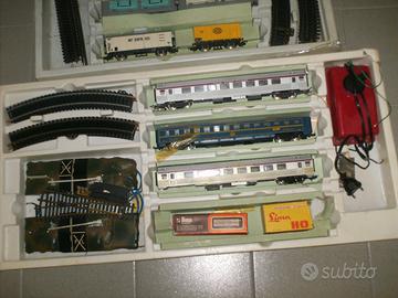 Serie non completa di vagoni e carrozze vari con una locomotrice ( funzionante ) + diversi binari ( dritti e curvi ) + alimentatore ( funzionante ) + vari accessori . Consegna solo a a mano .