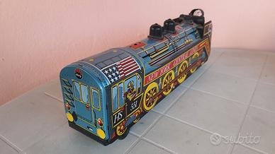 Modellino di trenino elettrico a pile, realizzato in metallo verniciato.