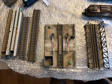 4 locomotive, 5 vagoni, 10 rotaie , un pomte grande, un ponte piccolo, passaggio a livello. Originali MARKLIN anni 50’. Si vendono anche separatamente.