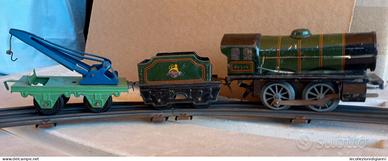 Trenino Latta Scala 0 Hornby by Meccano Locomotiva a molla + Tender e Carro Gru vintage tutto originale d'epoca non testato se&o