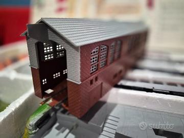 Locomotiva perfettamente funzionante con luci in base alla direzione di marcia, deposito, incrocio, sopraelevata, stazione con campanella all'arrivo del treno funzionante elettricamente, ponte girevole.