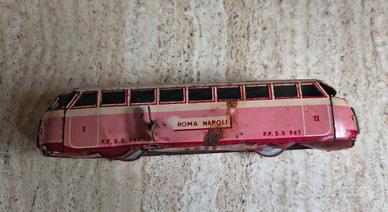 Bellissimo trenino giocattolo di latta, modello Littorina Roma-Napoli delle Ferrovie dello Stato (F.S.S.), marca INGAP. Questo pezzo vintage è un po' arrugginito ma mantiene il suo fascino retrò.