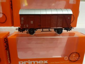 Carri merce chiusi Marklin Primex scala HO, nuovi di zecca, tolti dalle scatole solo per le foto, anno di produzione 1986, telaio e ruote in metallo, scatole originali, 10 euro al pezzo. Acquisti multipli unica spedizione.