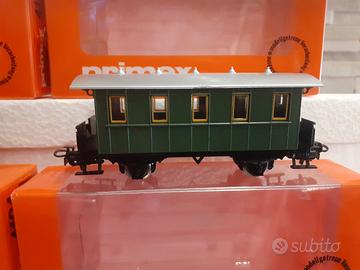 Convoglio passeggeri Marklin Primex scala HO, nuovo di zecca mai utilizzato, composto da 3 carrozze passeggeri e 1 carro postale, ruote in metallo, scatole originali. Acquisti multipli unica spedizione.