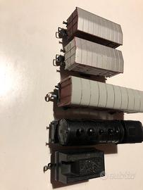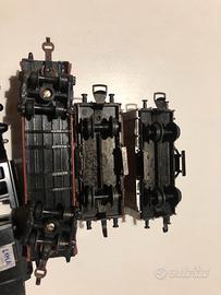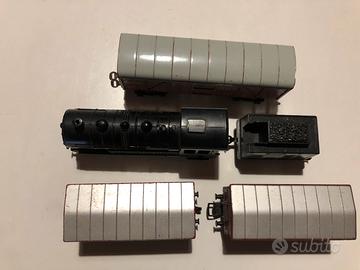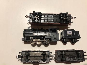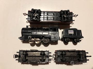 Trenini Lima in scala H0 /una locomotiva Lima funzionante /un carro carbone / 2 vagoni merci lima /regalo un vagone merci senza marca /assali e ganci dell’epoca / condizioni come da foto visto e piaciuto