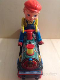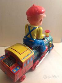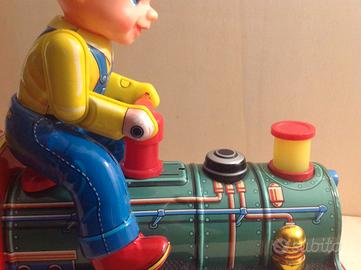 Giocattolo fine anni '60 in latta il treno si muove e il bimbo dondola- Funzionamento a pile (non incluse) con sede perfettamente pulita non ossidata