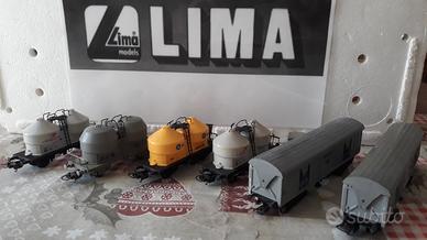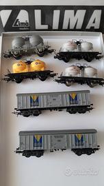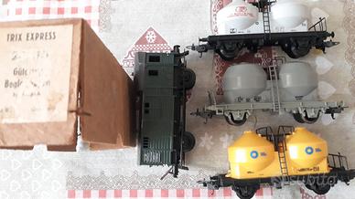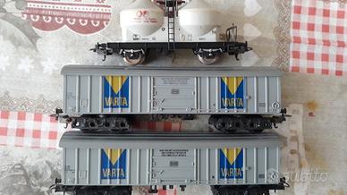 6 Carrozze merci di cui 2 a carro chiuso a 4 assi delle D.B a tetto apribile Varta ;4 carri Silos di varie amministrazioni ferroviarie tutte in ottimo stato senza scatole OMAGGIO 1 carrozza trix in metallo CONTATTO SOLO MAIL