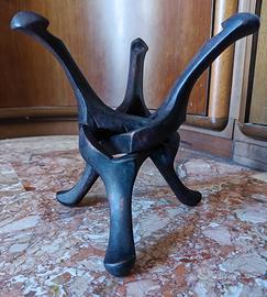 1-Scultura a treppiede in legno intagliato (alto circa cm 25) con gambe curve che si intersecano e si aprono verso l’esterno, creando una base stabile per sostenere un oggetto (tipicamente una ciotola, ma non solo);