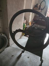 Struttura robusta in metallo, piano di alimentazione in legno, volano e trasmissione a cinghia.