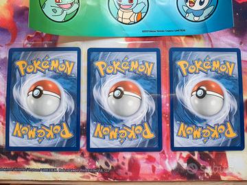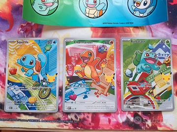 Trio Starter di 1° e 7° generazione del 30° anniversario Pokemon. Nuove, appena sbustate, bordi e angoli ottimi, nessun difetto sulla superficie, subito messi in sleeve morbida. Scambio a mano a Genova e dintorni! Venduto con gli adesivi e 10 codici TCG omaggio