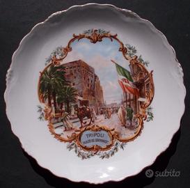 La guerra italo-turca (1911-12) diede all'Italia il possesso della Tripolitania e della Cirenaica. Nella seconda metà degli anni '20 la conquista di quei territori fu ricordata con una serie di piatti celebrativi. Fabbricati in Slesia, essi hanno il marchio C. T. Altwasser impresso sul fondo. La sigla C. T. identifica il fondatore della manifattura, Carl Tielsch (1815-1882), mentre Altwasser (oggi Stary Zdroi) corrisponde alla vecchia denominazione della località in cui sorse la fabbrica. Ogni piatto è abbellito da un disegno stampato. Tutti i disegni sono contornati da un motivo a cornice di foglie d'acanto. Nell'area bassa della cornice è inserito un cartiglio con una didascalia al suo interno. Sono qui proposti 8 piatti della serie, così titolati: Tripoli - Marabutto nell'oasi; Tripoli - Moschea della Dara; Tripoli - Una strada di notte; Derna - Strada al mare; Tripoli - Palazzo del Governatore; Tripoli - Strada di Bumellana; Marabutto - Dintorni di Tripoli; Tripoli - Il porto. Ciascuno di essi misura 18,5 cm. di diametro. Difetti: le dorature ai bordi sono consumate; il piatto Moschea della Dara ha il decoro sbiadito; il piatto Derna ha due sbeccature e due corte lineature; il piatto Tripoli - Il porto ha una breve lineatura. Il prezzo si intende riferito all'insieme degli otto manufatti, che non sono vendibili singolarmente. I piatti possono essere ritirati a Varese o a Milano oppure possono essere ricevuti per posta.
