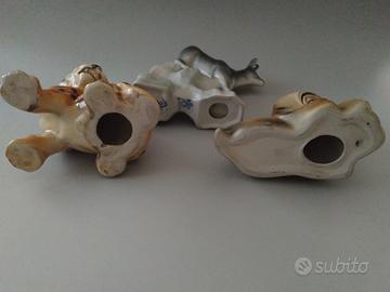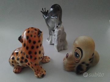 Tre bellissime statuine vintage rappresentanti animali, un ghepardino, leopardino di Ronzan, un cagnolino Beagle e uno stambecco in ceramica/porcellana marca ARPO Apoteca de Arges. il prezzo è riferito al lotto.